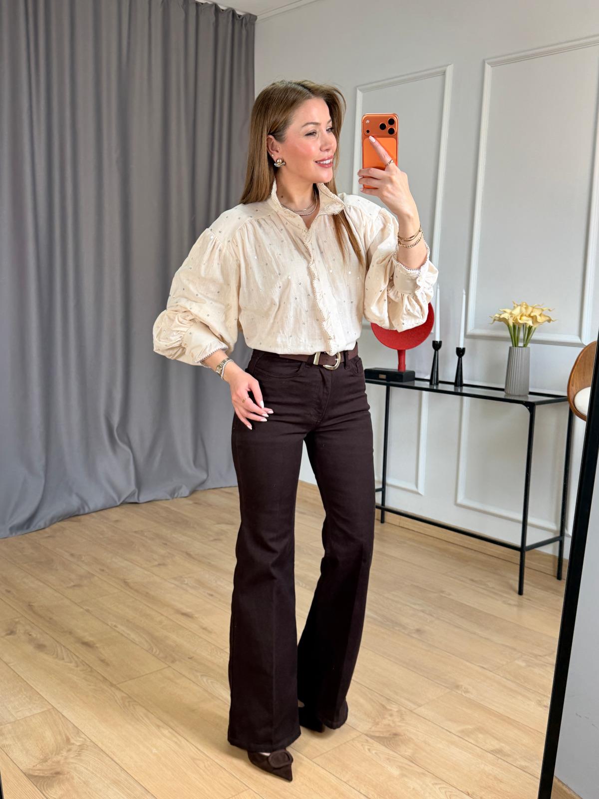 Kahve Pullu Gömlek Kahve Kemerli İspanyol Paça Jean