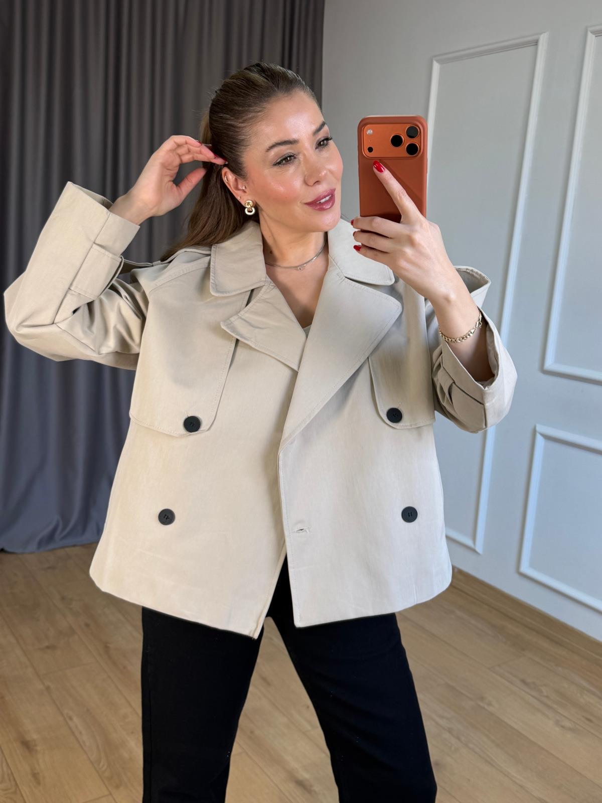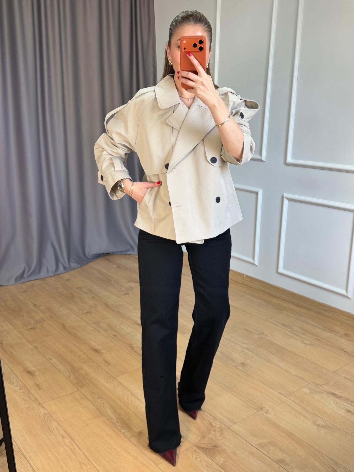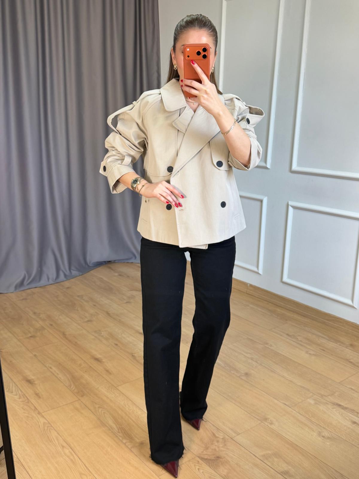 Bej Siyah Düğmeli Kısa Trençkot