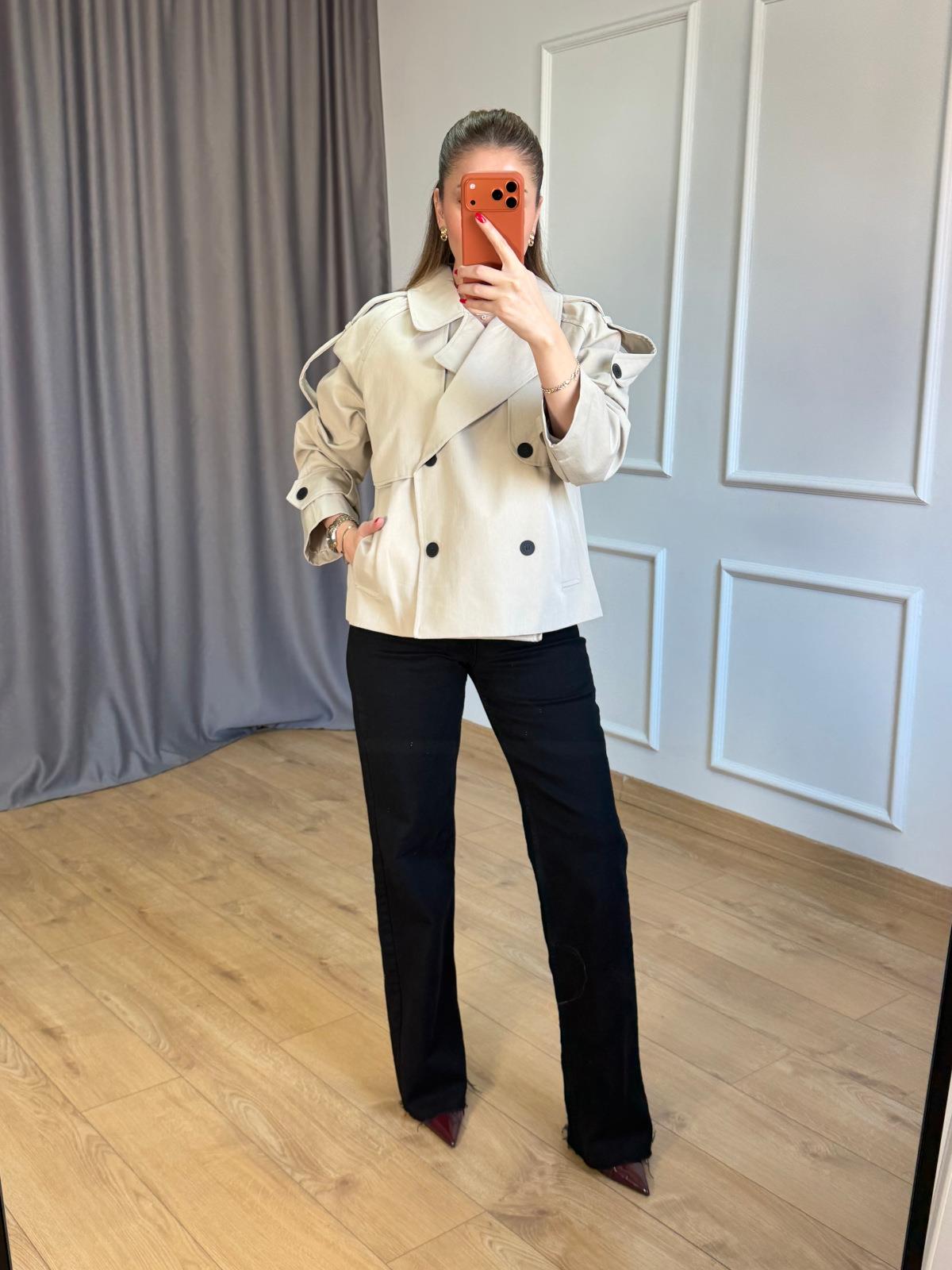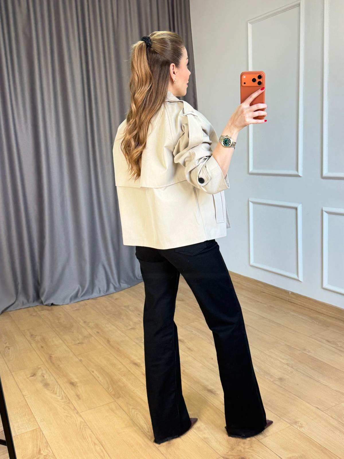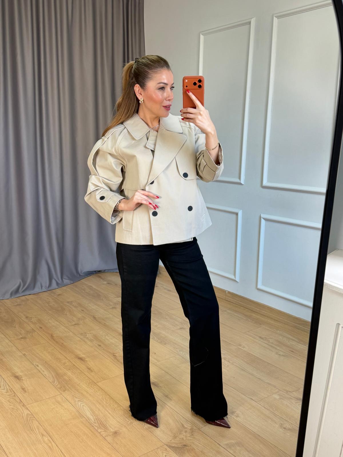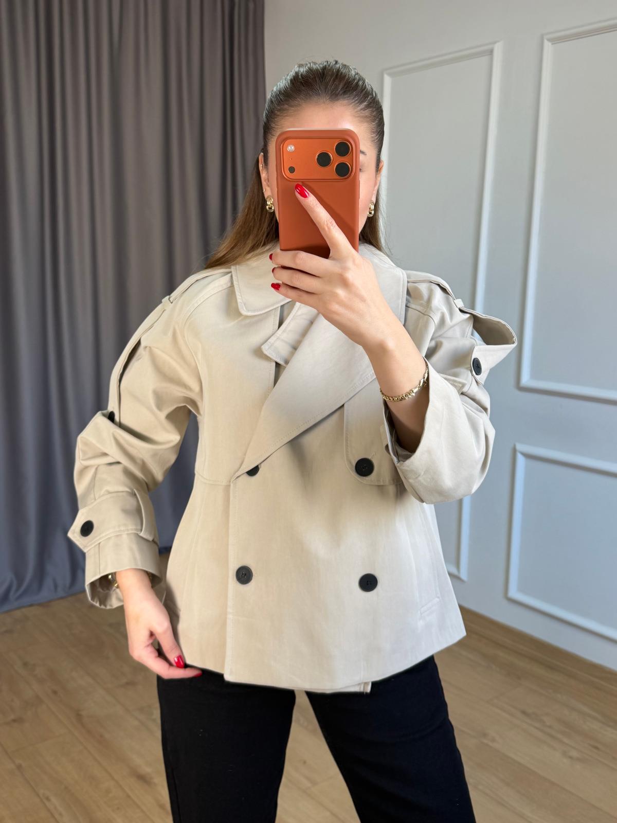 Bej Siyah Düğmeli Kısa Trençkot
