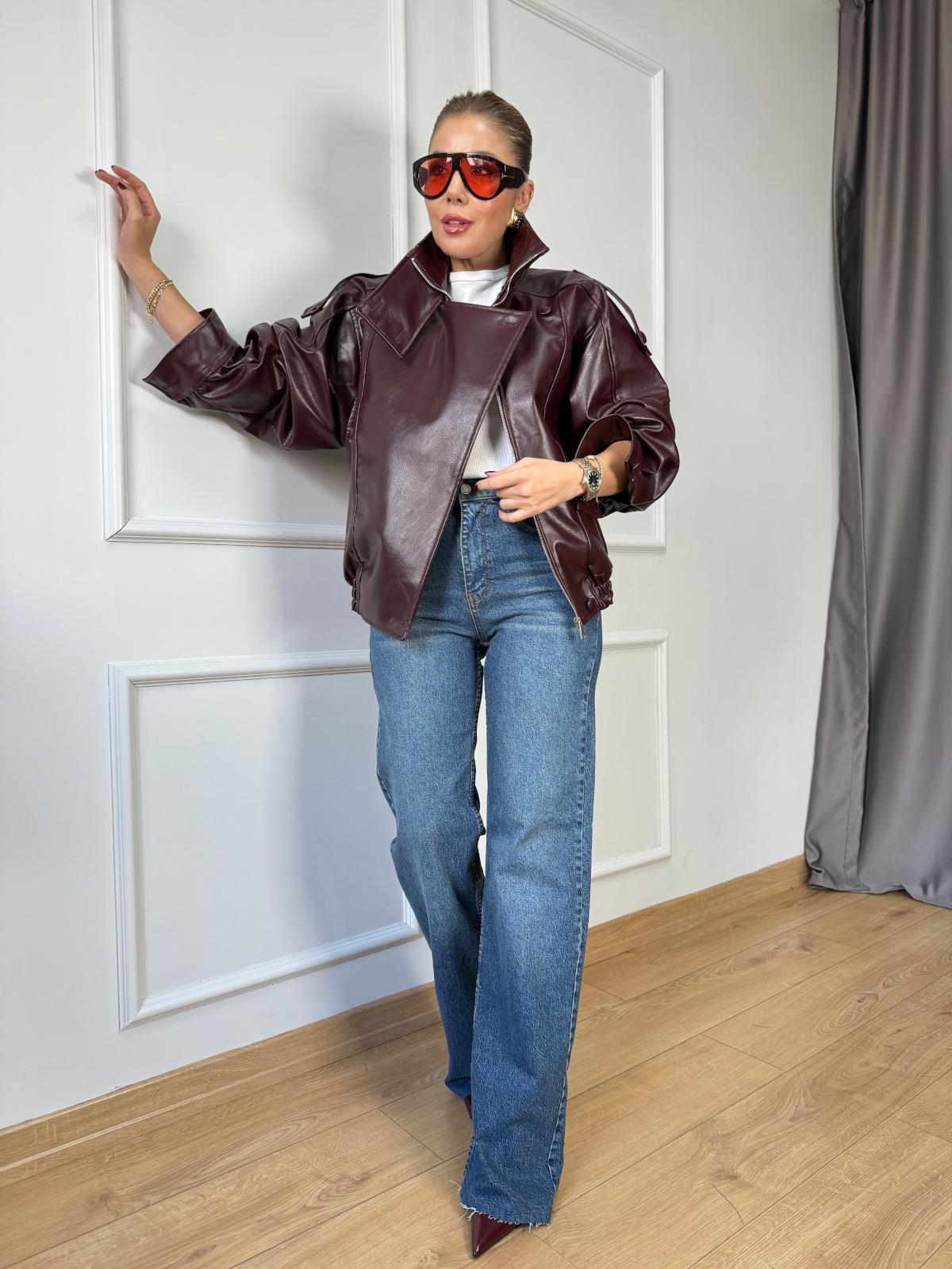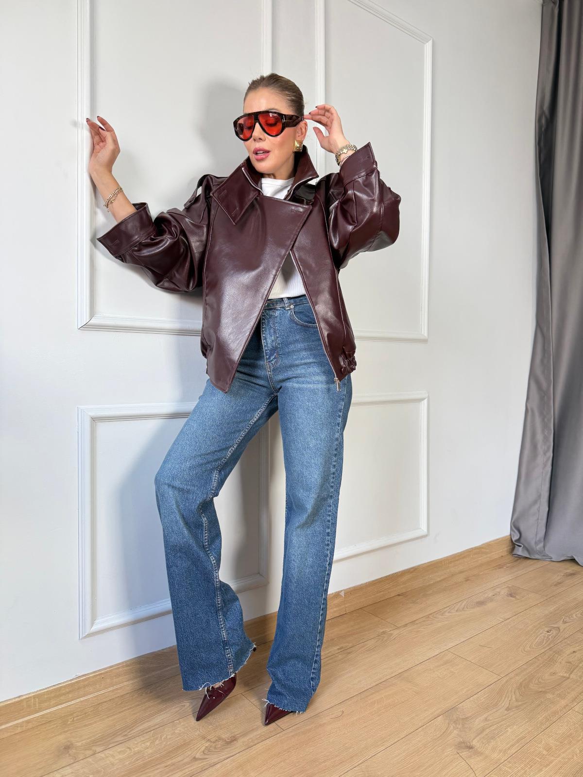 Kahve Deri Bomber Ceket Mavi Wide Leg Jean