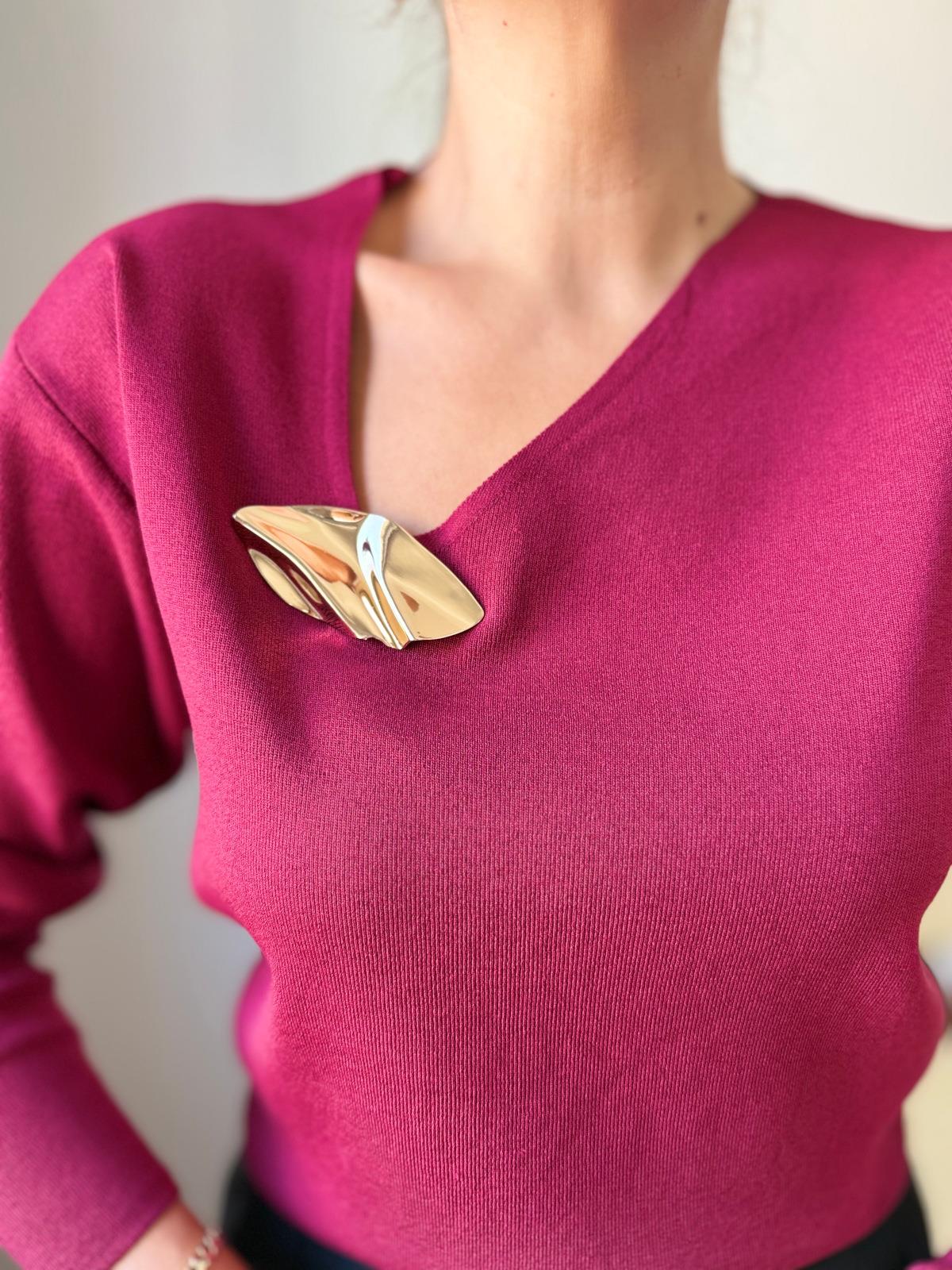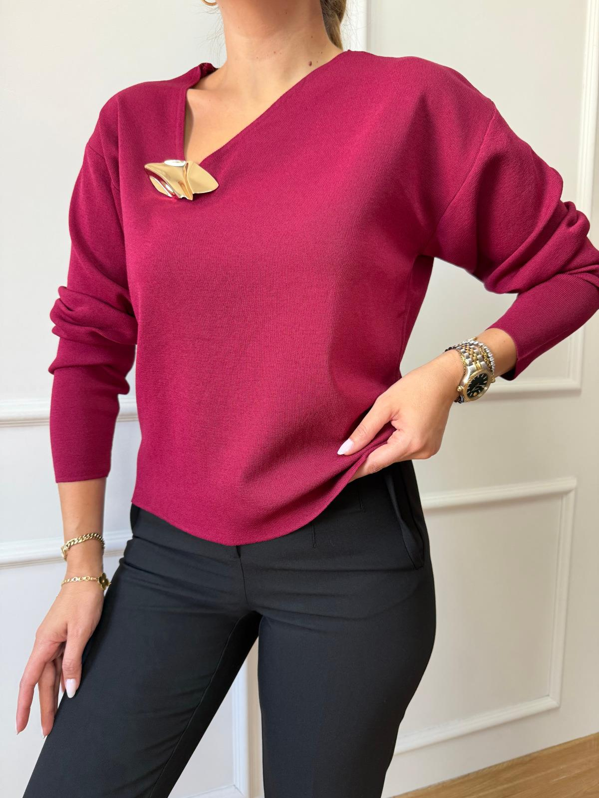 Bordo Ön Gold Aksesuar Detaylı Uzun Kol Bluz