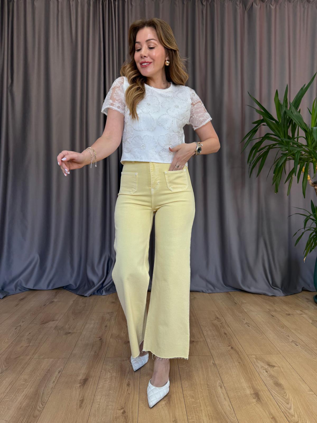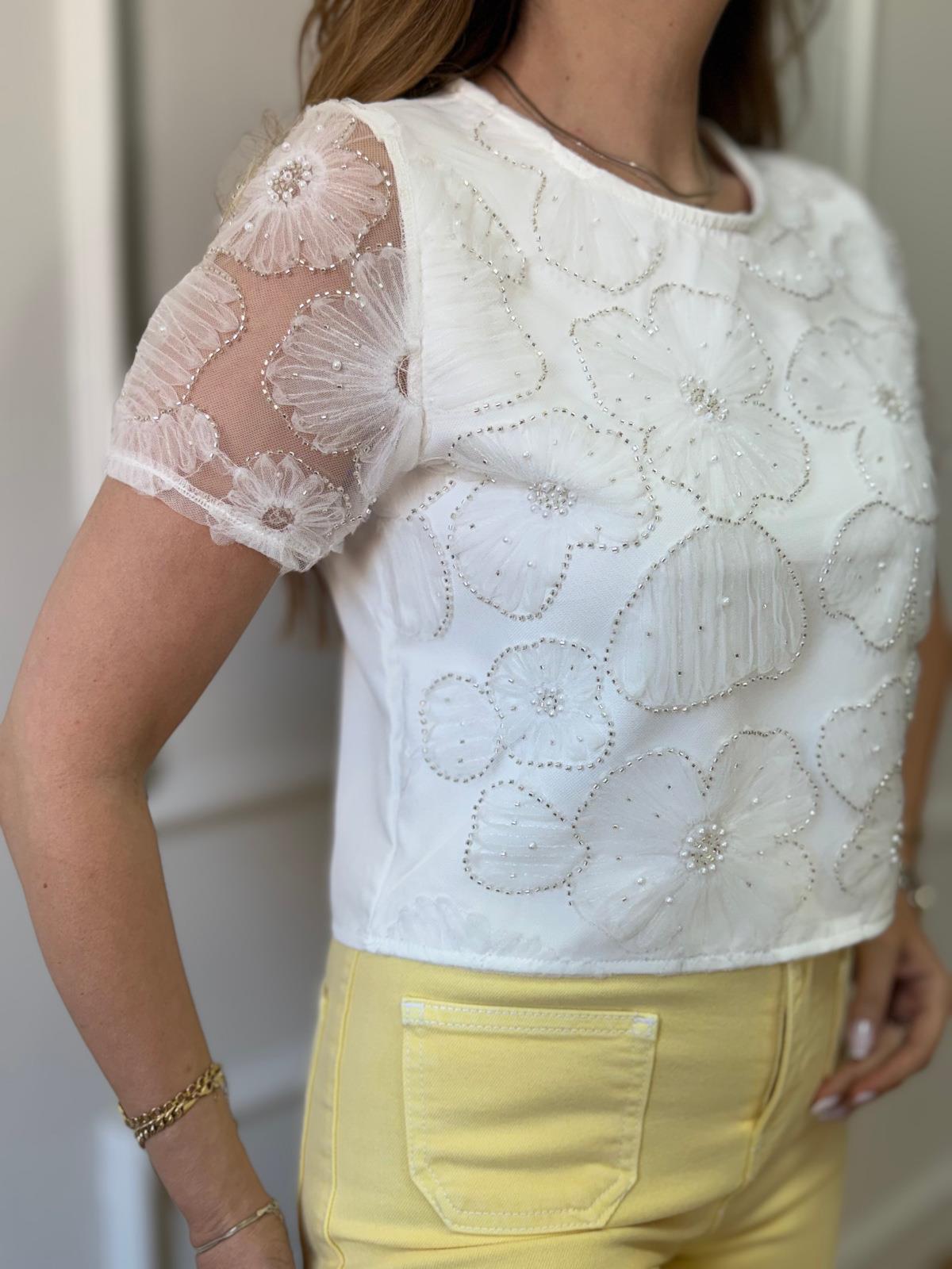 Ekru Boncuk İşlemeli Çiçekli Yarım Kol Bluz
