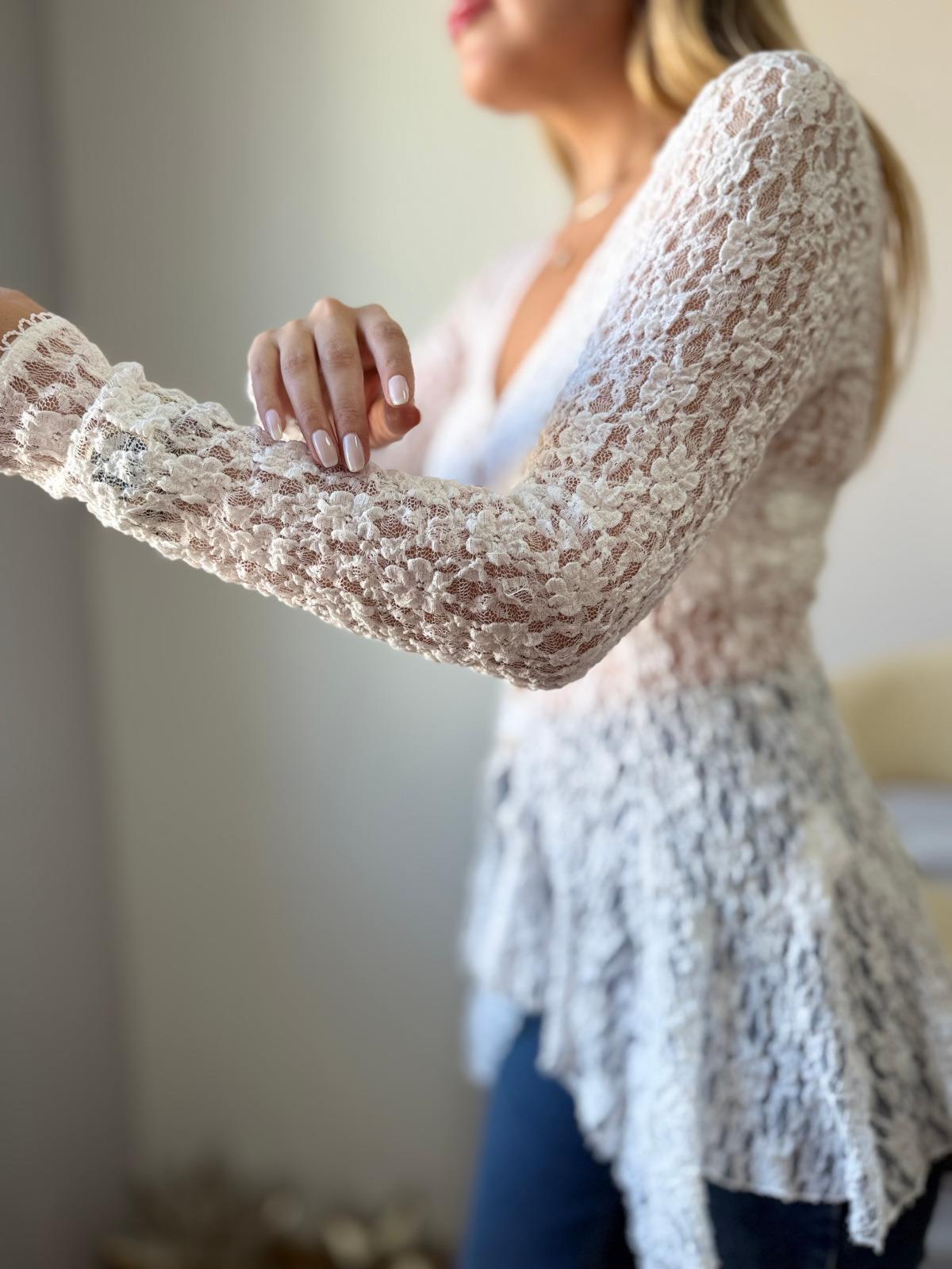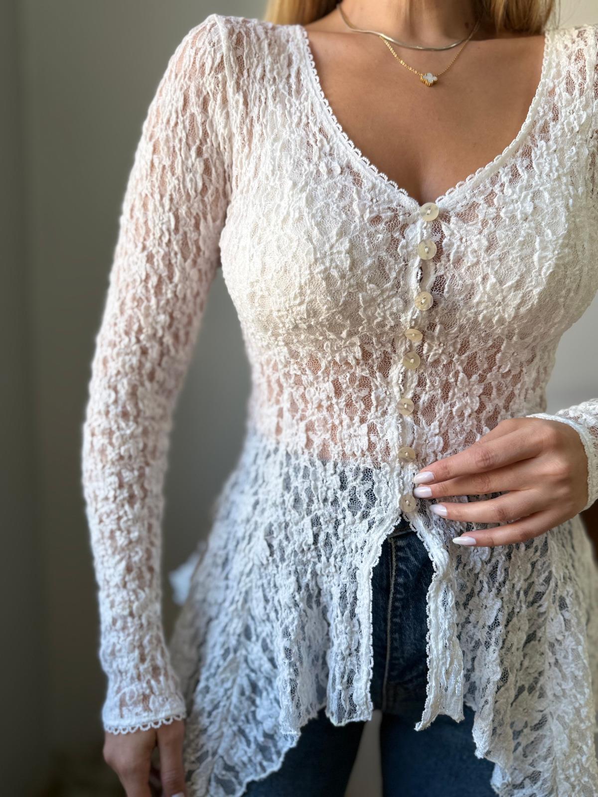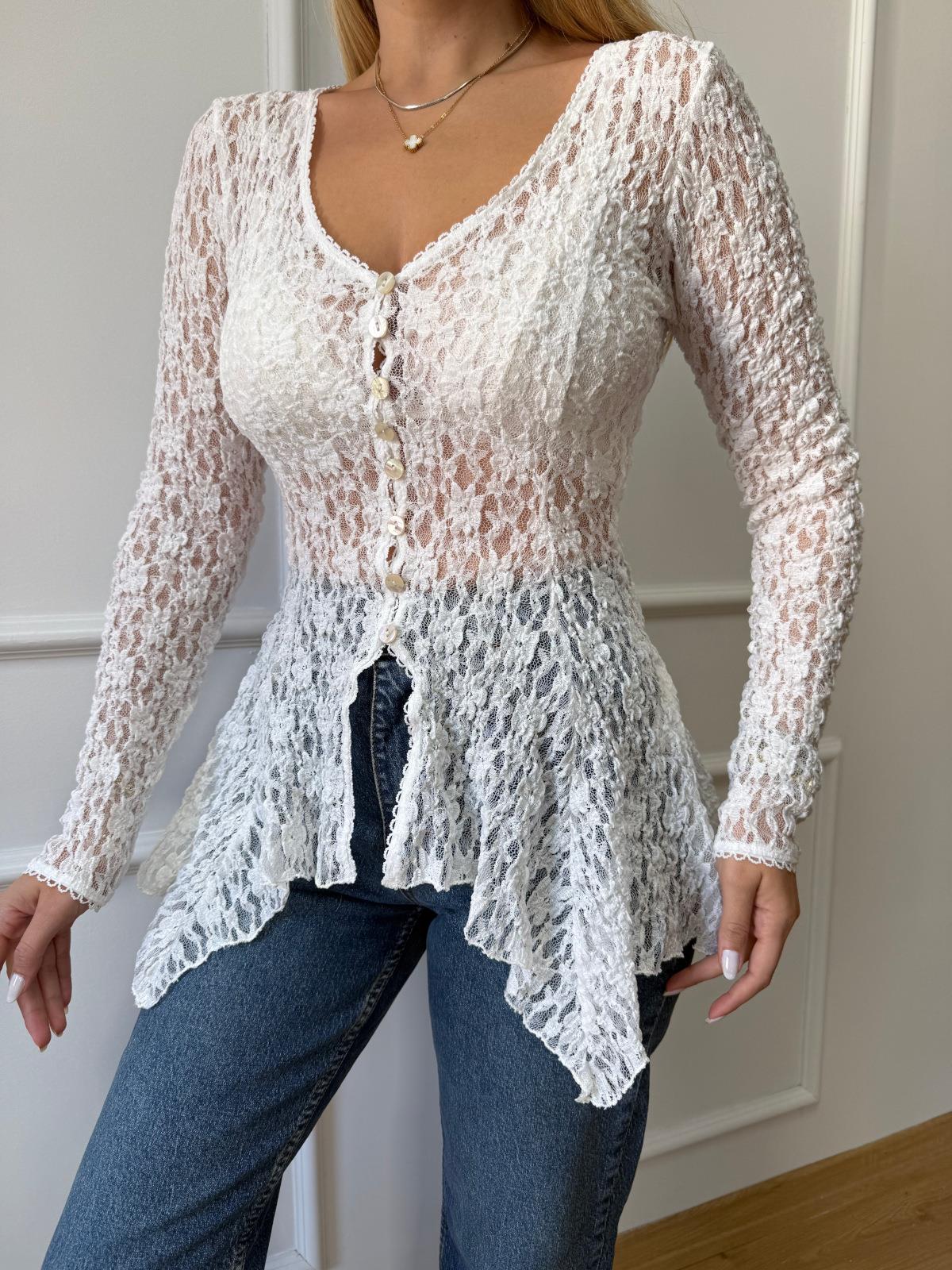 Ekru Etek Ucu Volanlı Transparan Bluz