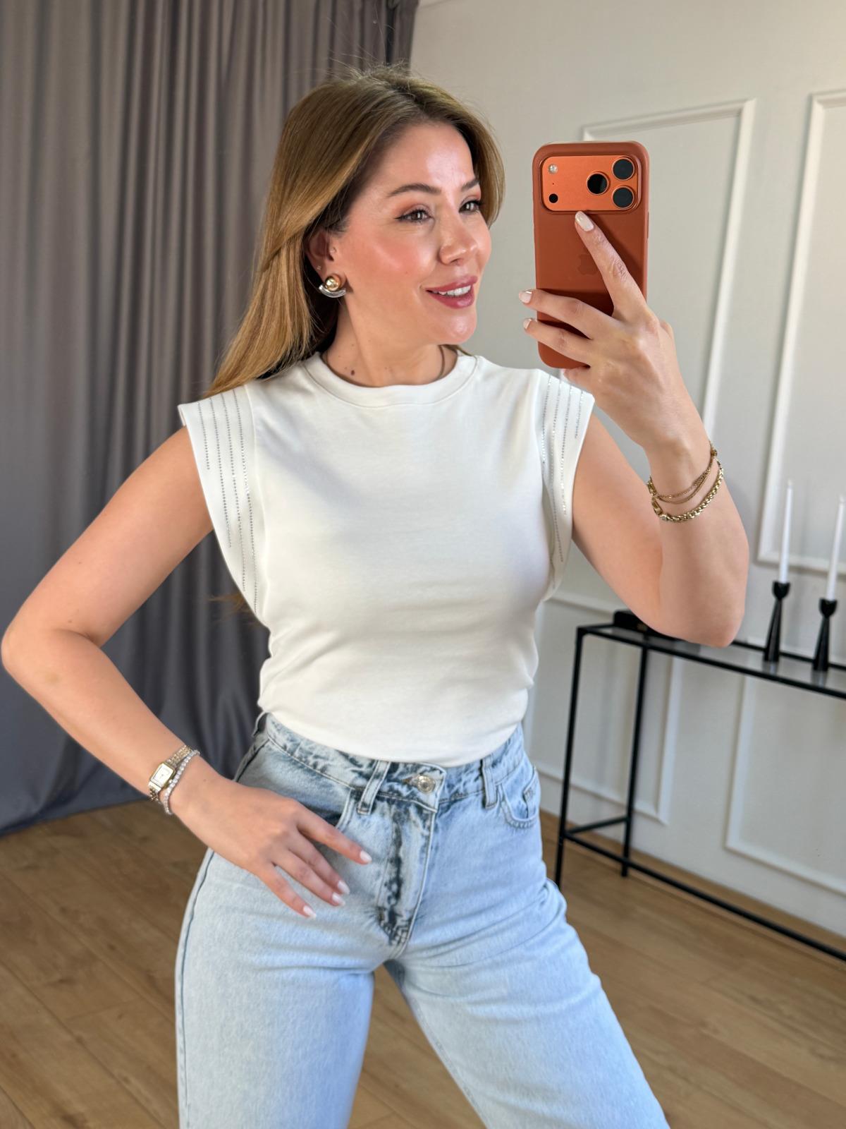 Ekru Omuz Şerit Taşlı Tshirt (SZ07625)