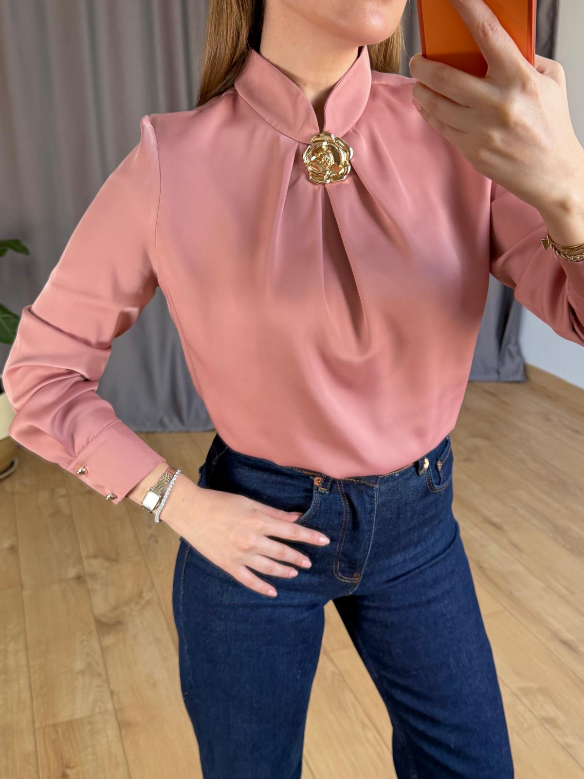 Gül Kurusu Mini Dik Yakalı Gold Broşlu Bluz