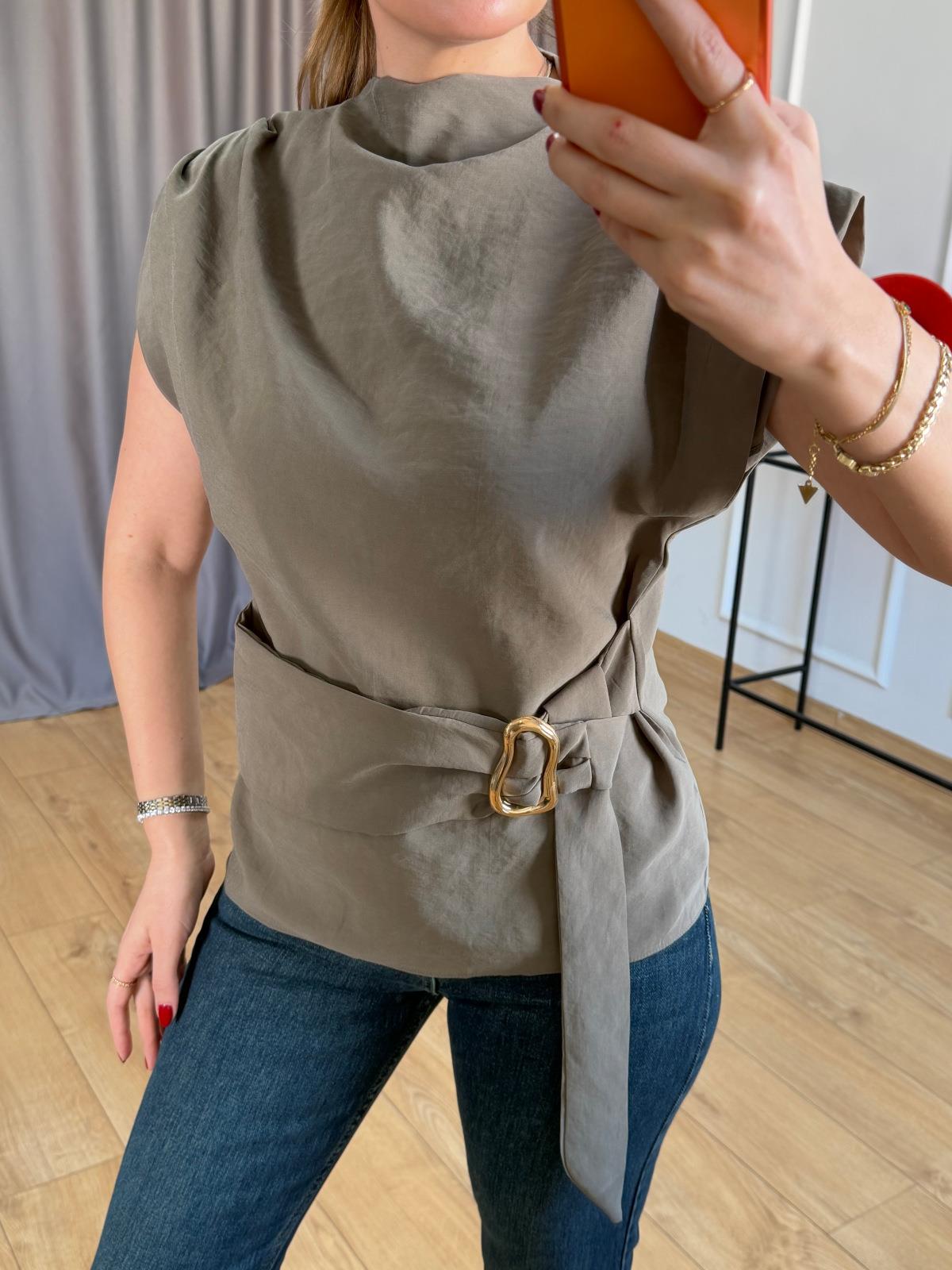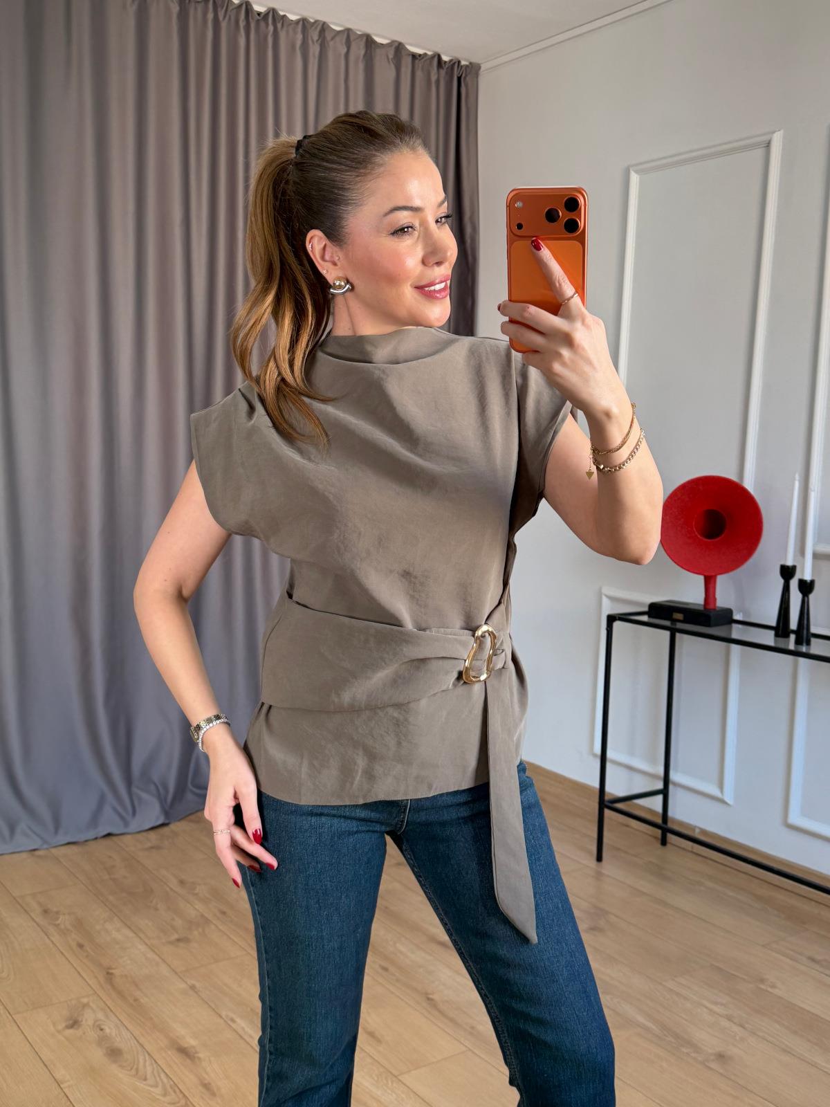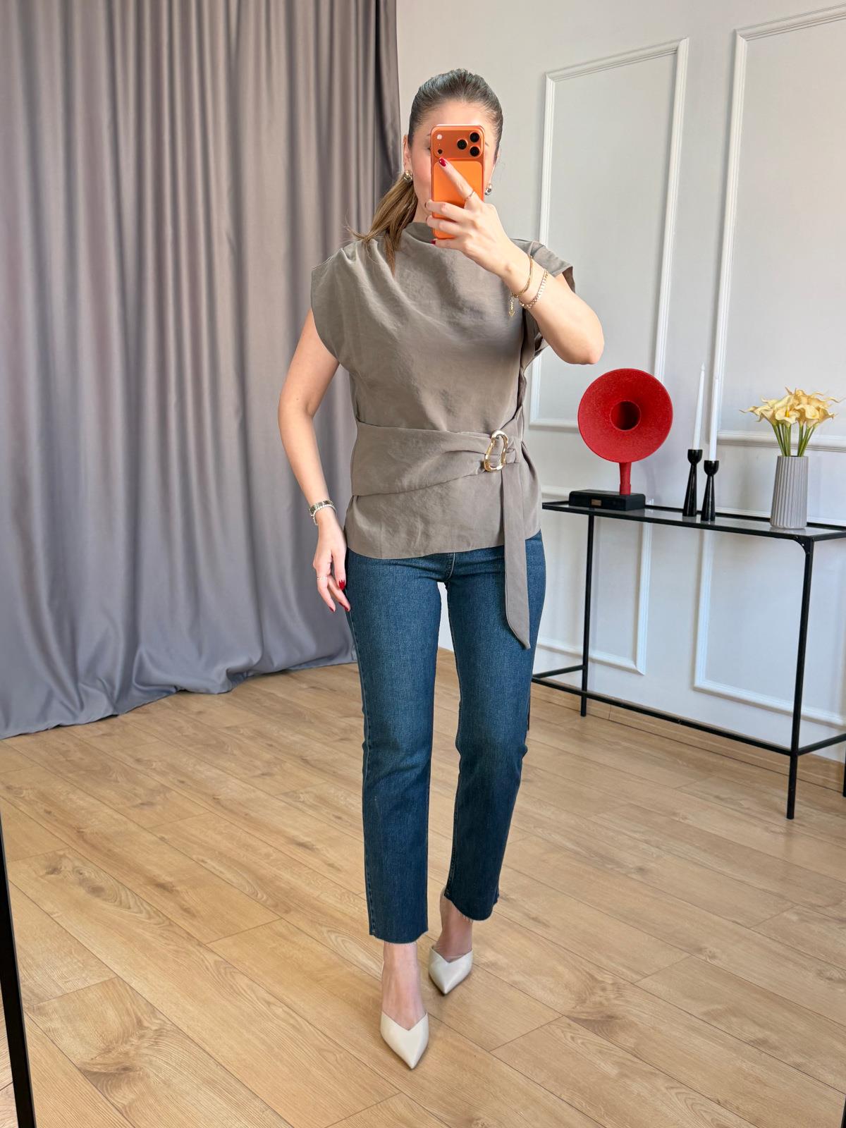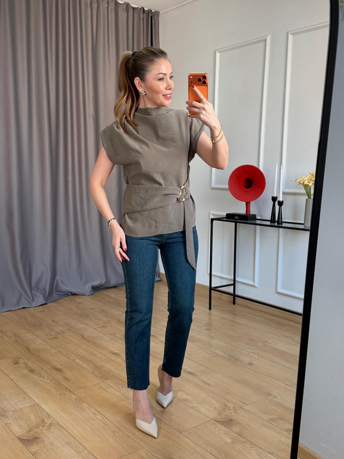 Ekru Gold Tokalı Bluz Petrol Kesik Paça Jean