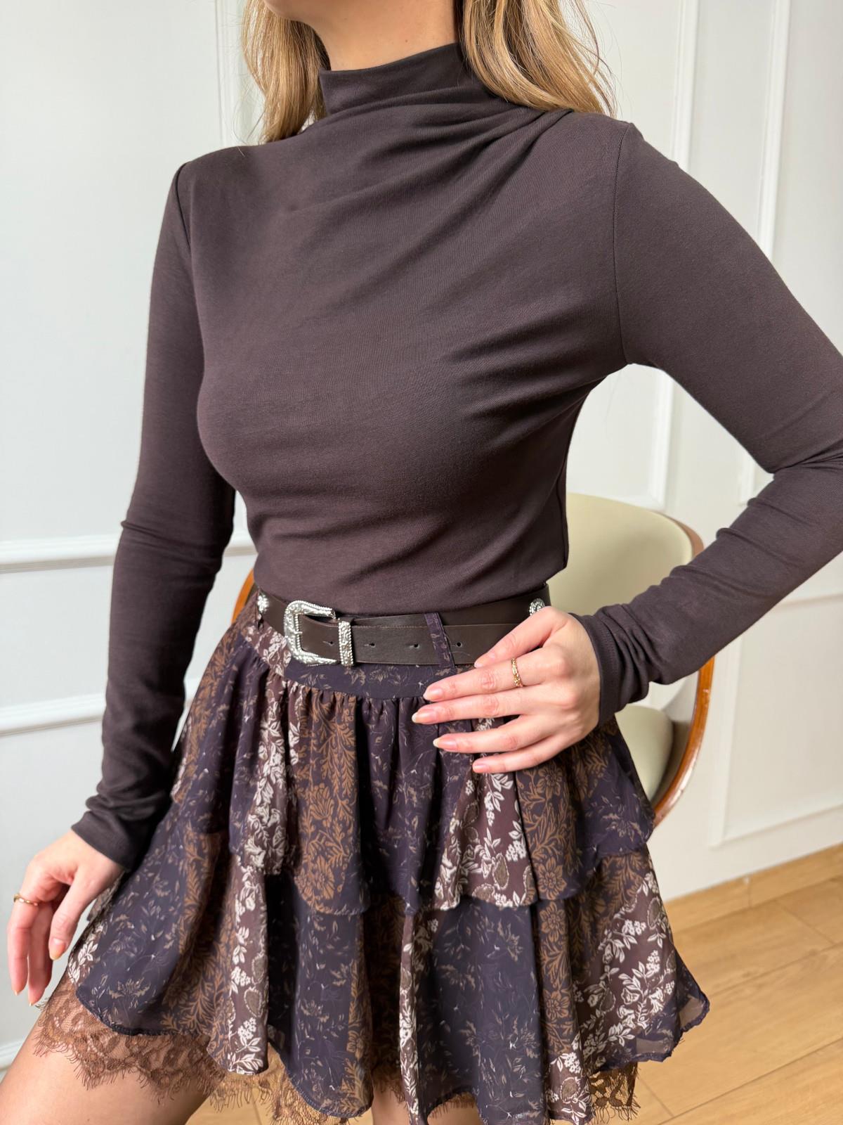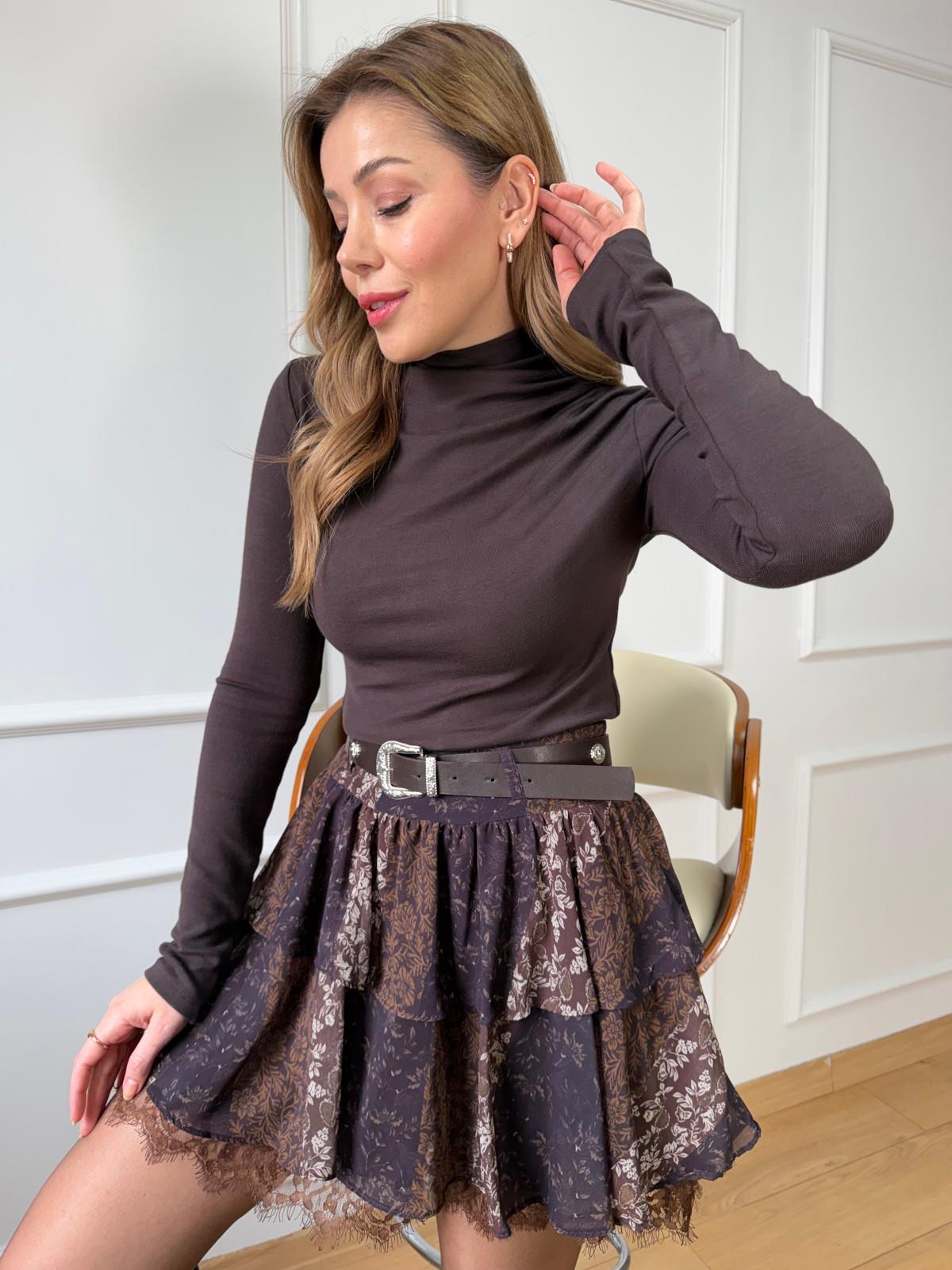 K. Siyah Omuzu Pileli Bluz Kahve Çiçek Desenli Katkat Etek