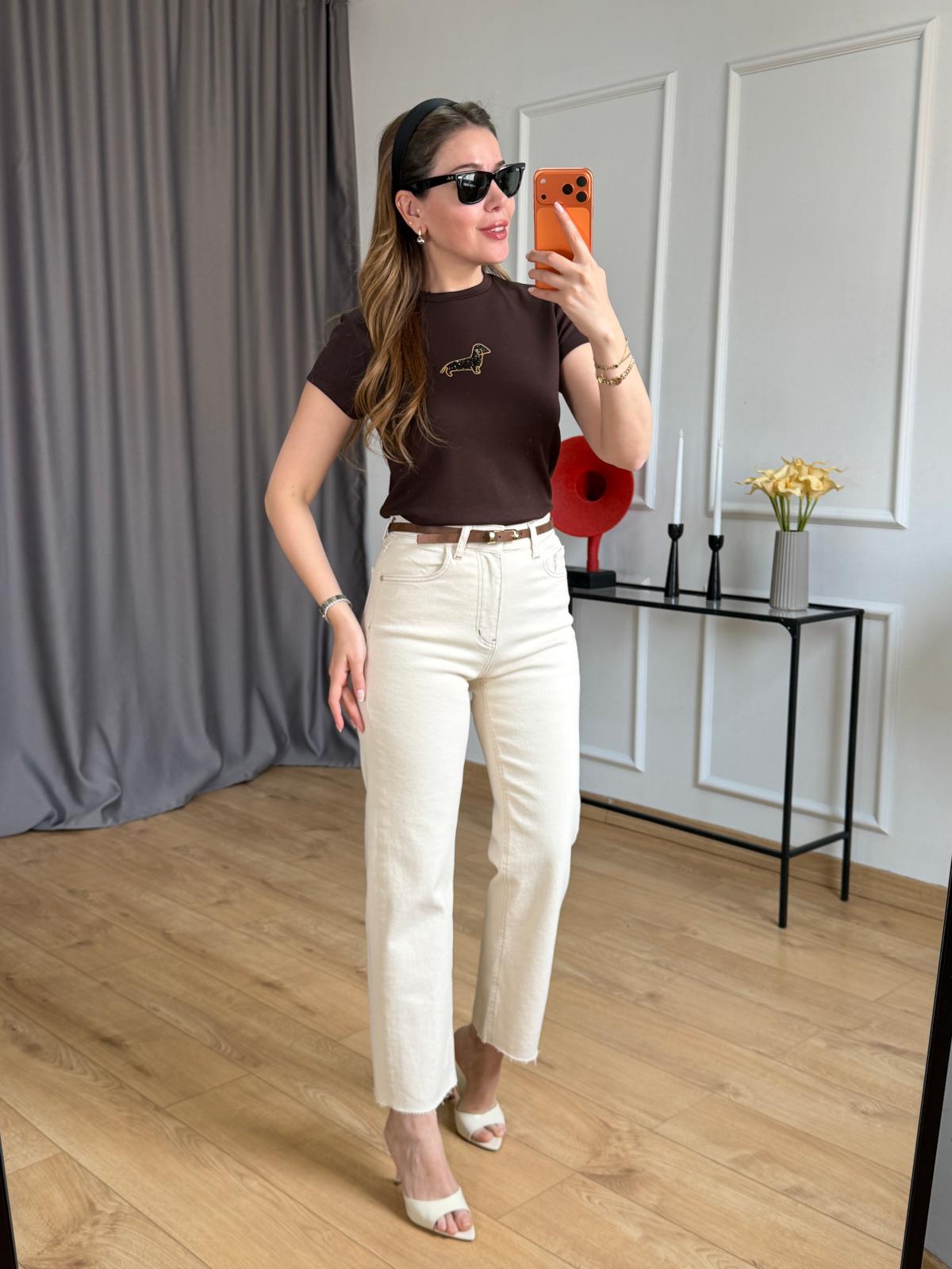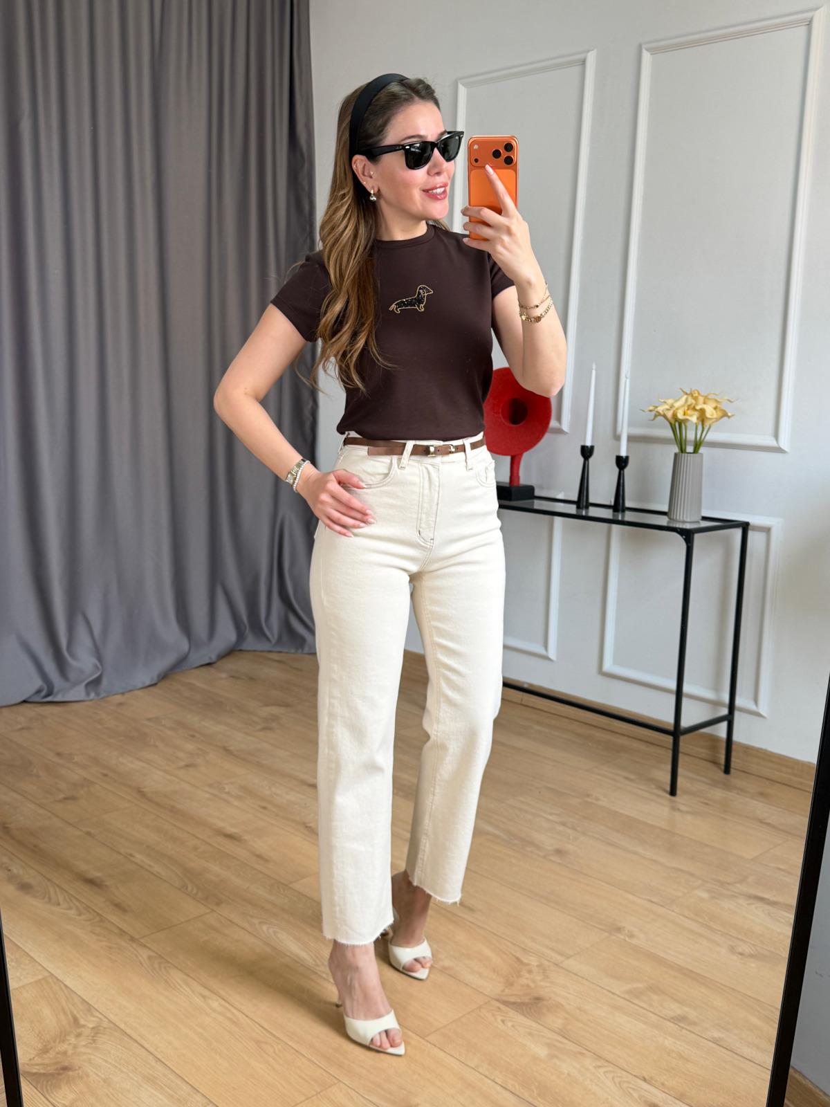 Ekru Dog Tshirt Siyah Dog Tshirt Bej Kemerli Kesik Paça Jean