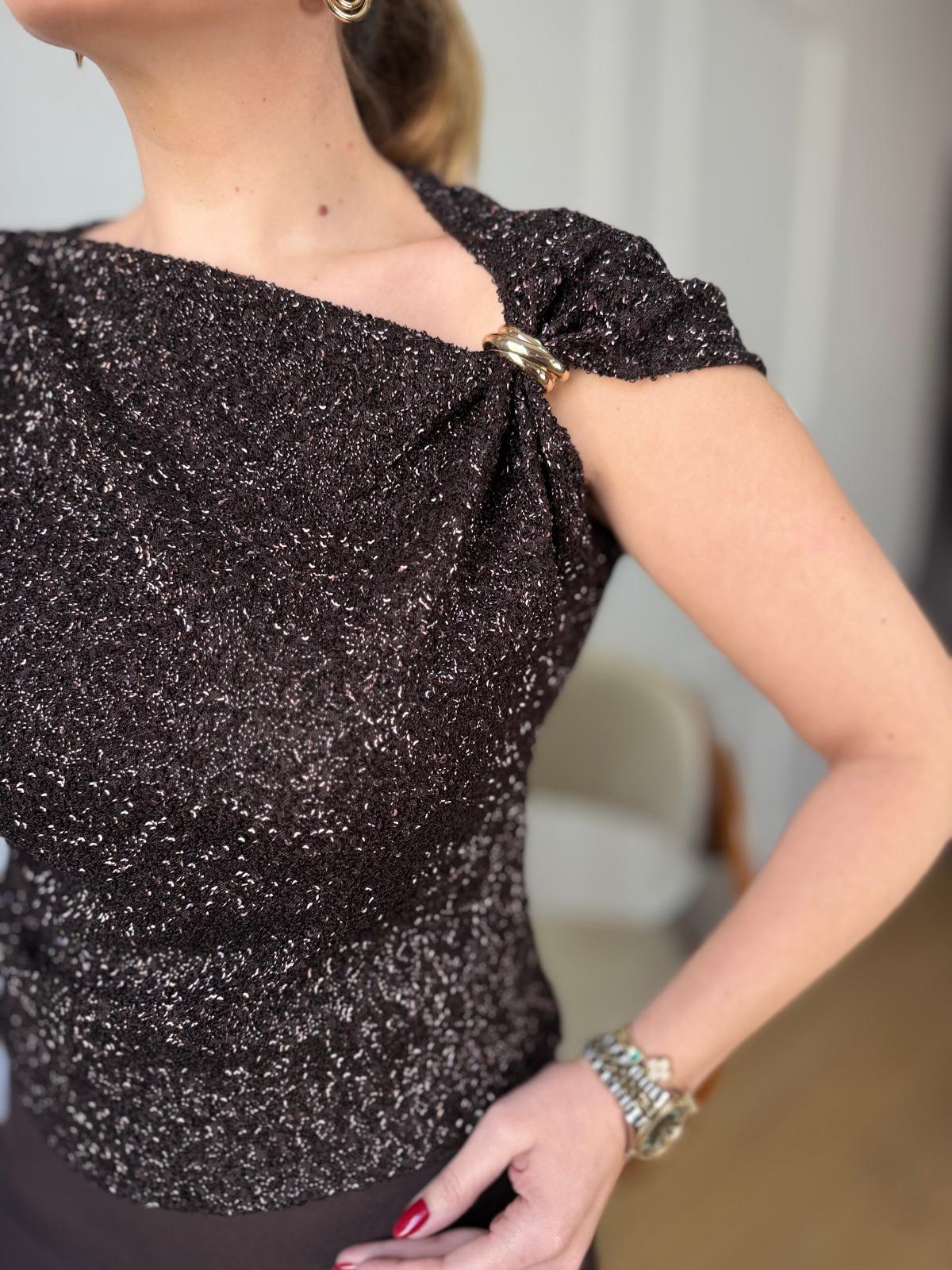 Kahve Gold Aksesuarlı Taşlı Bluz