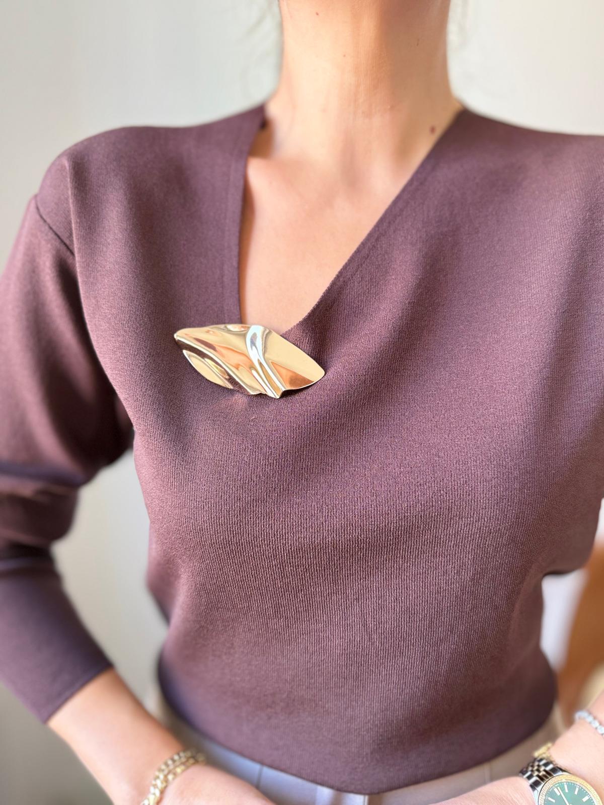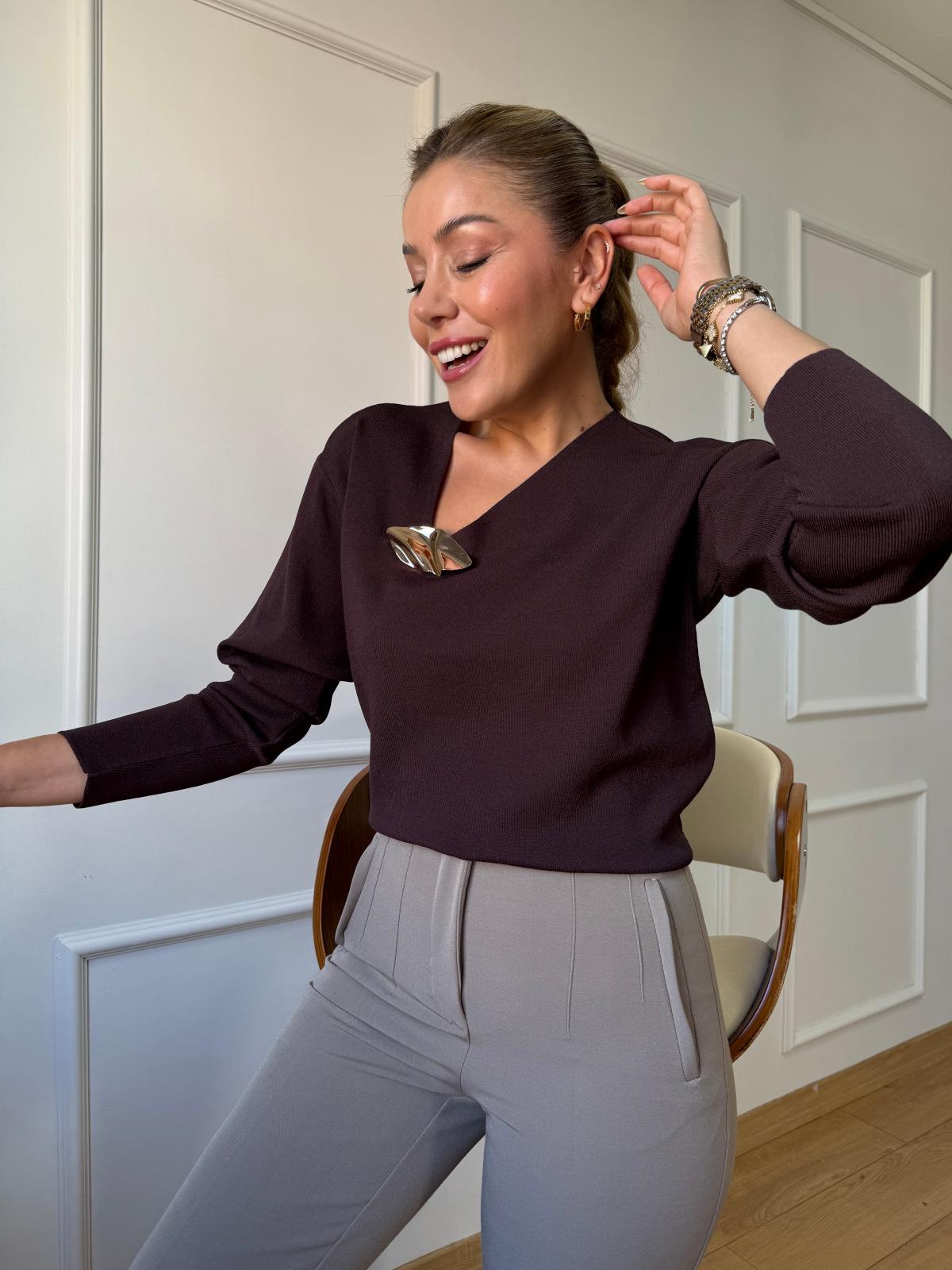 Kahve Ön Gold Aksesuar Detaylı Uzun Kol Bluz