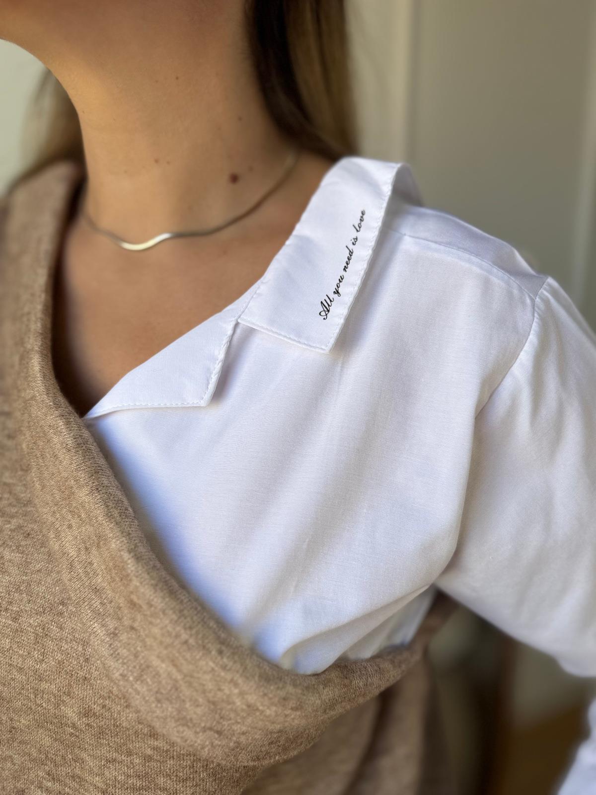 Kahve Yaka Yazı Detaylı Gömlek Bluz