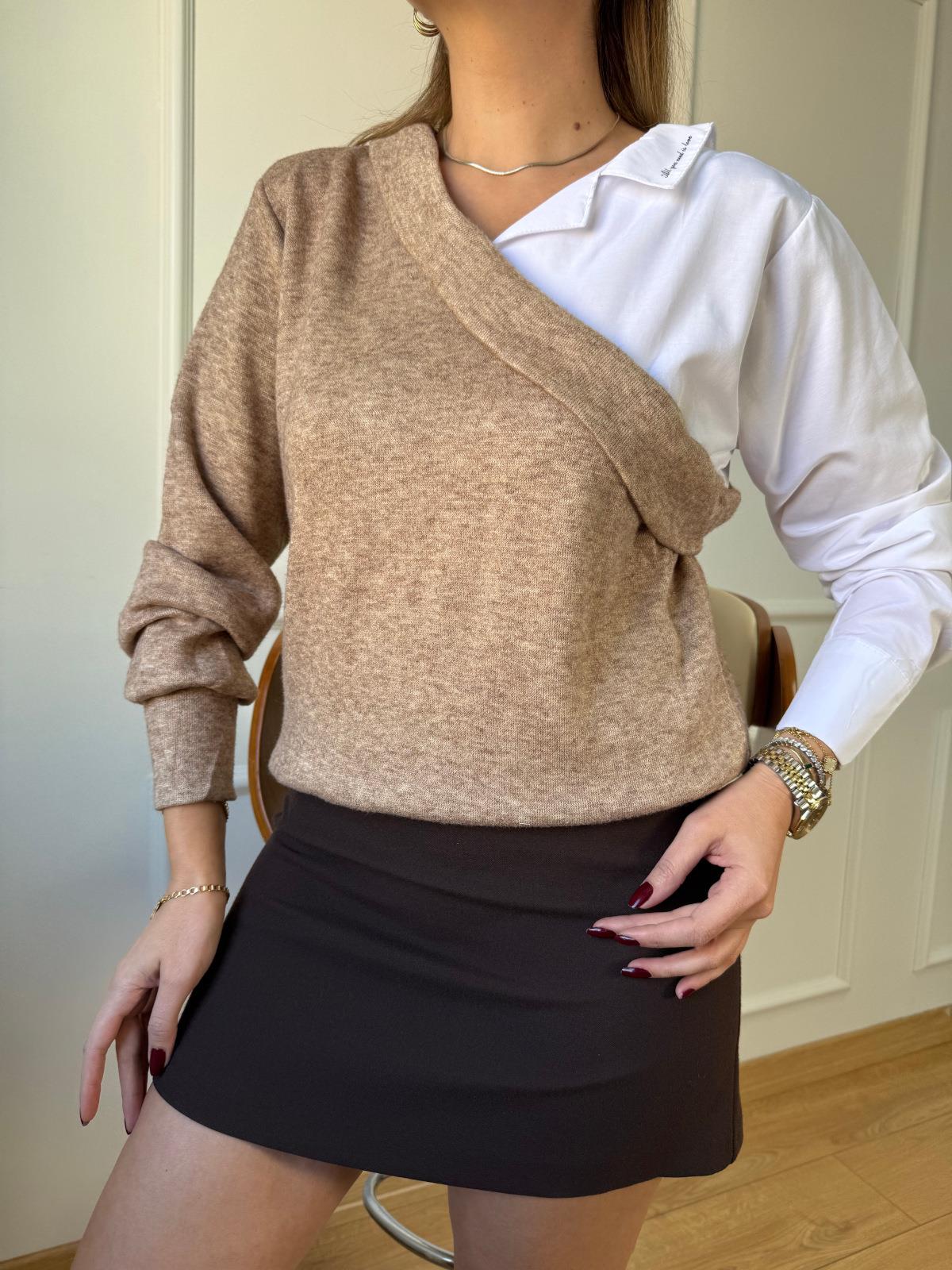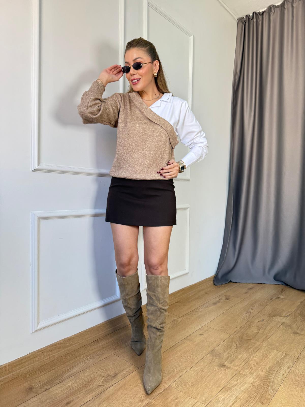 Bej Yaka Yazı Detaylı Gömlek Bluz Siyah Yaka Yazı Detaylı Gömlek Bluz Kahve Etek