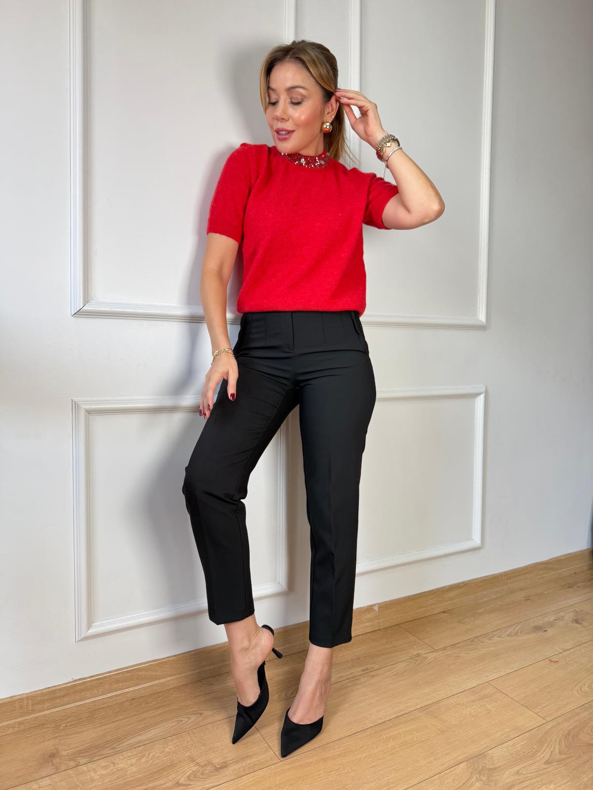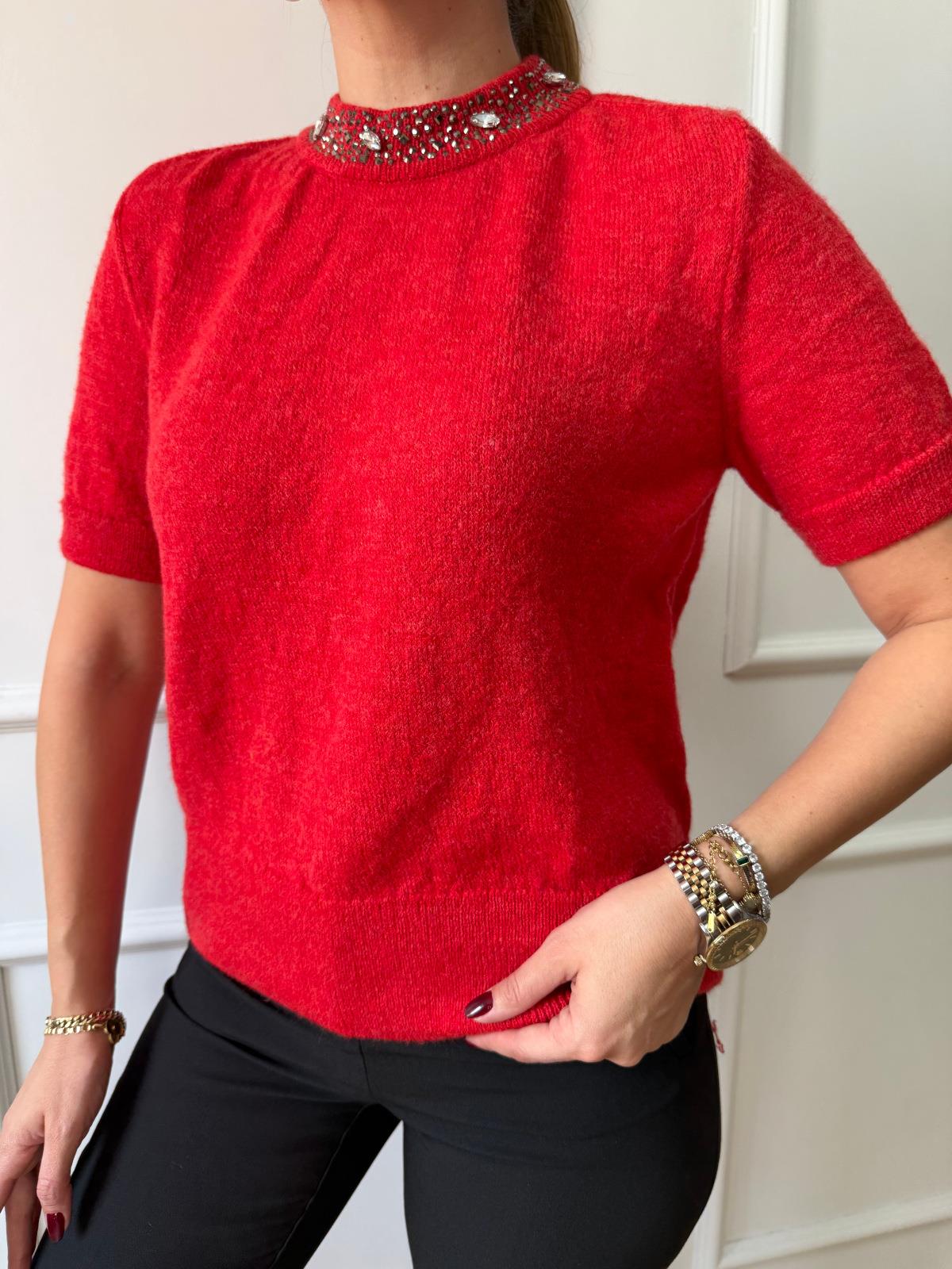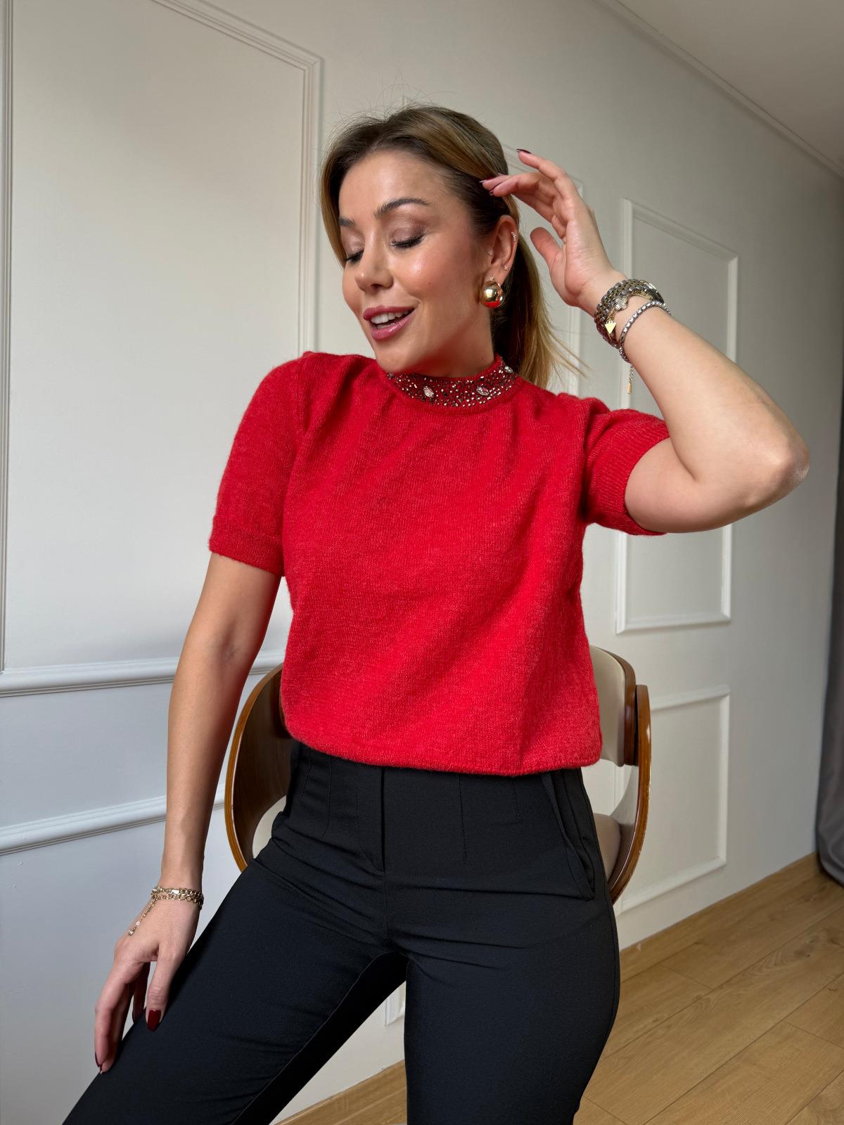 Kırmızı Yarım Kol Yaka Taşlı Kazak