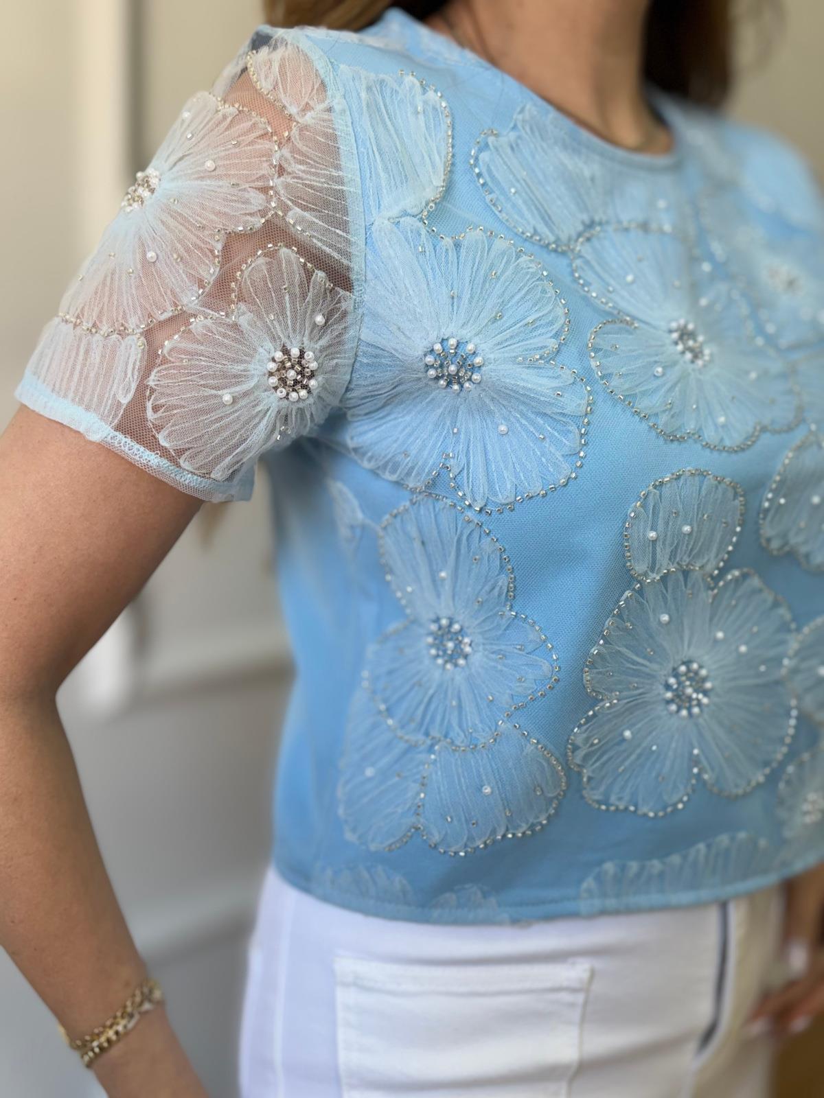 Mavi Boncuk İşlemeli Çiçekli Yarım Kol Bluz