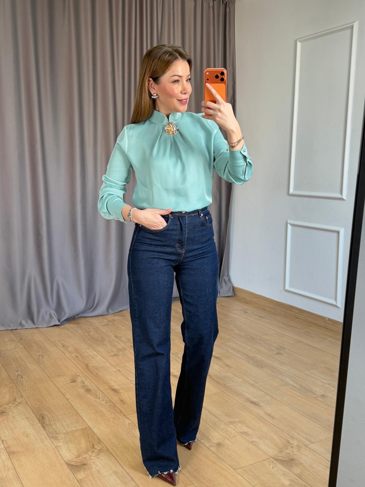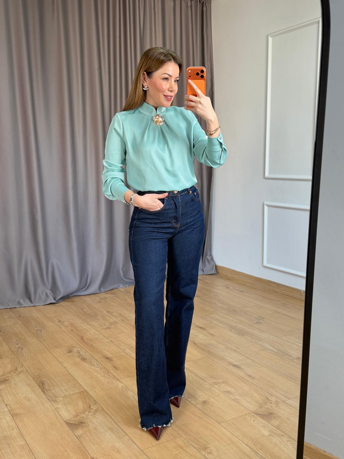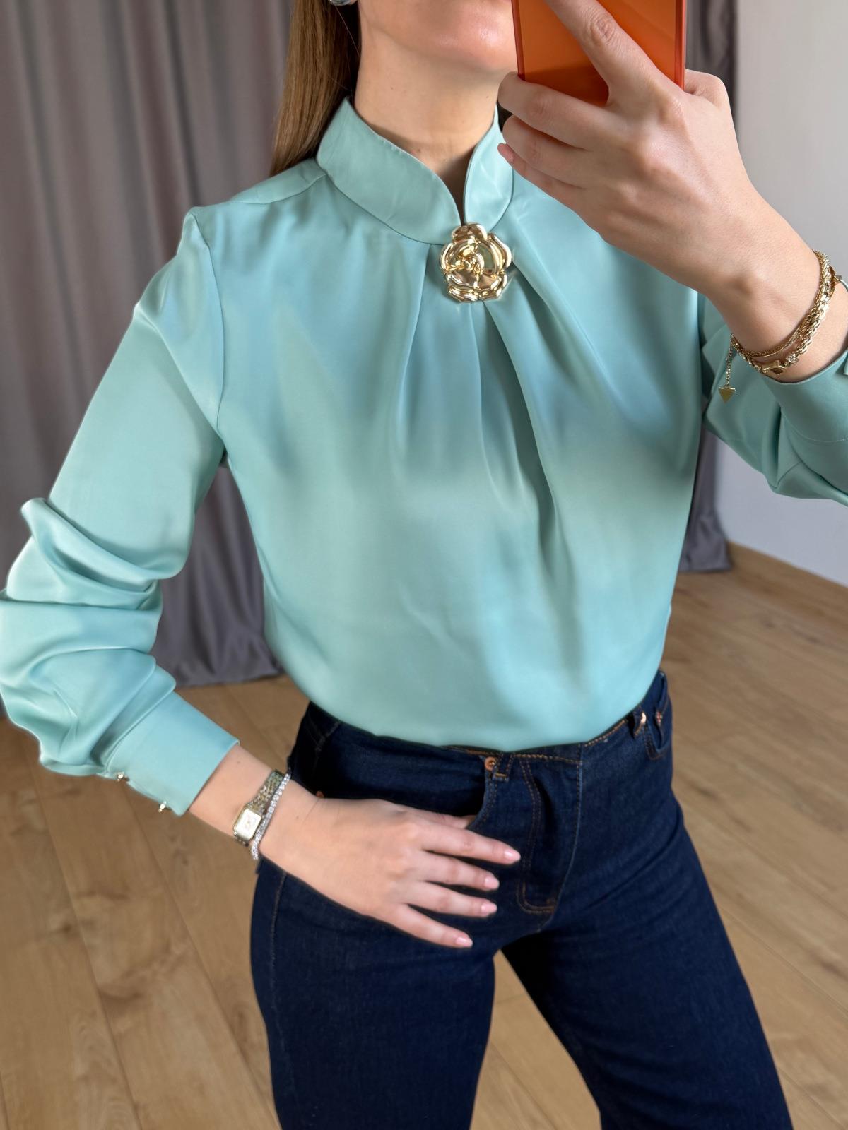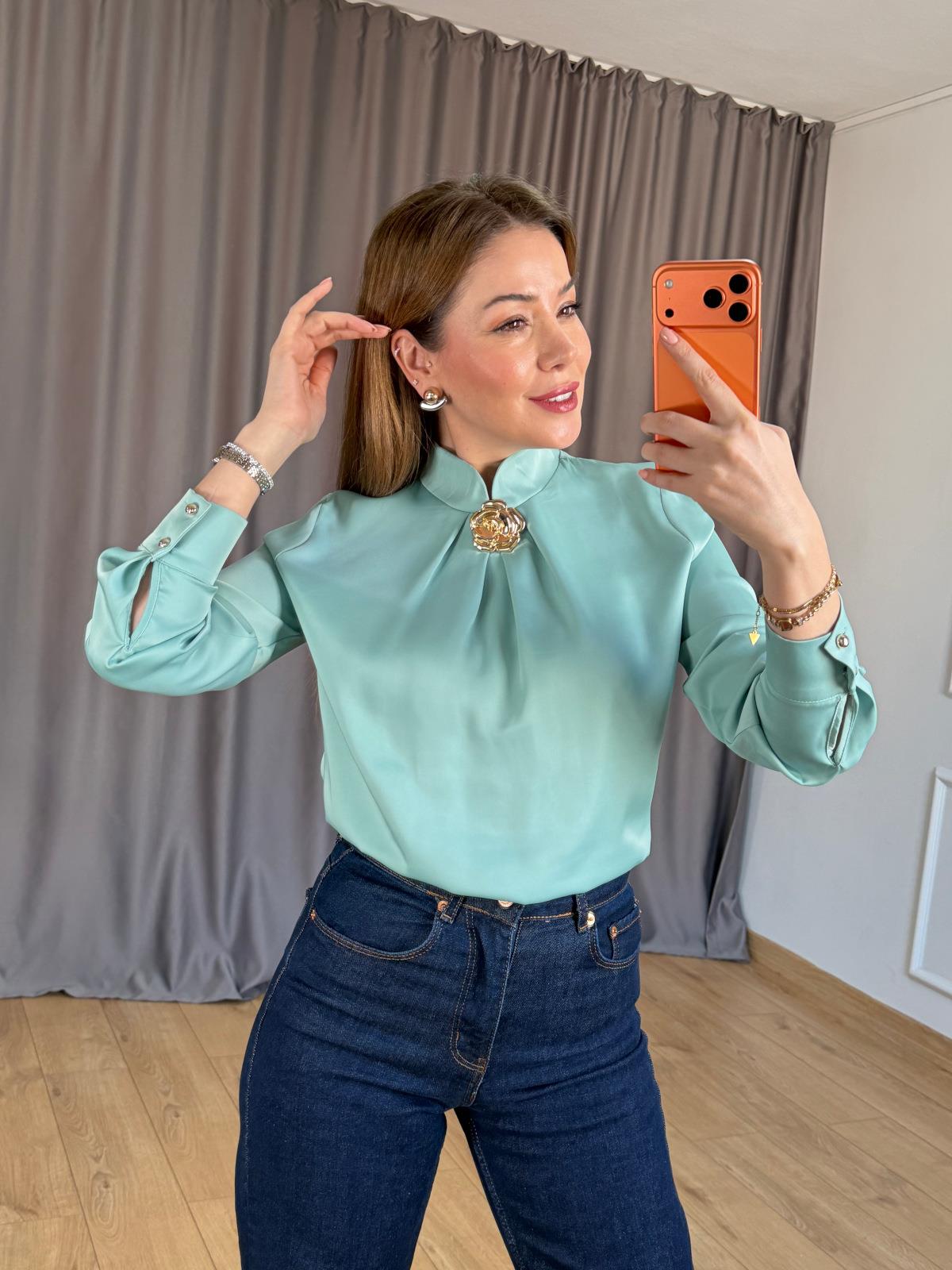 Mint Yeşili Mini Dik Yakalı Gold Broşlu Bluz