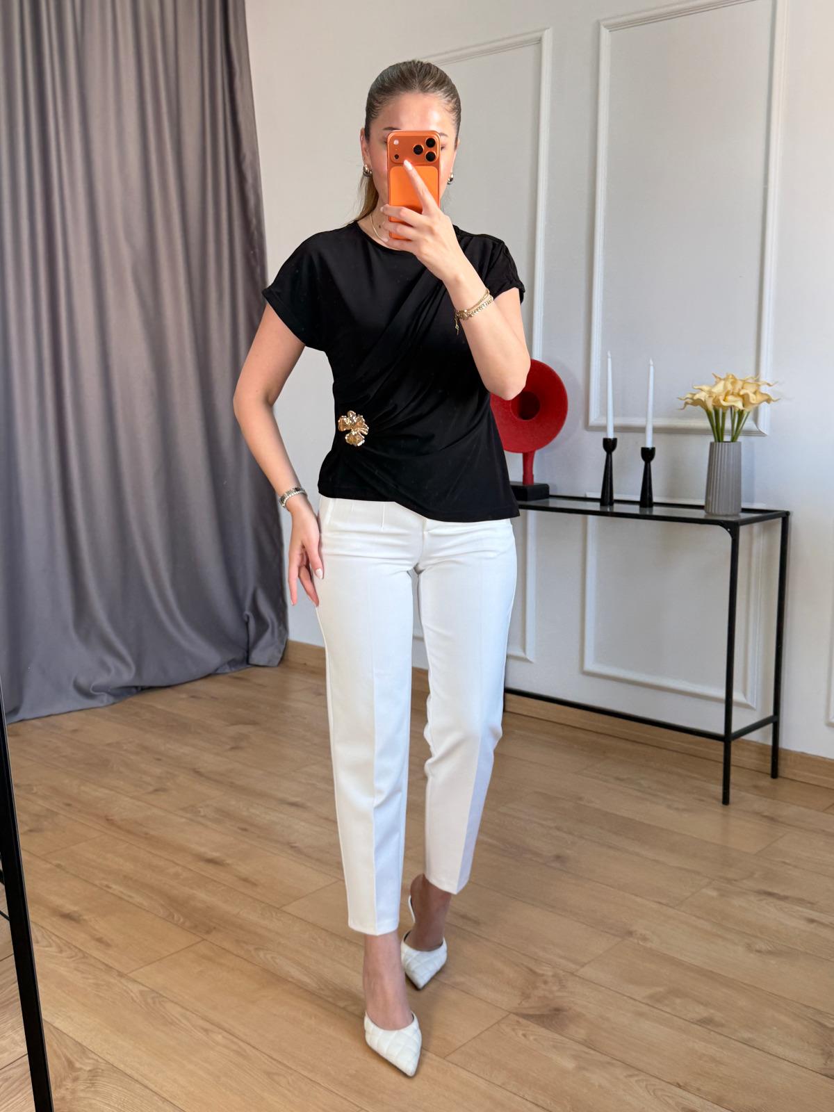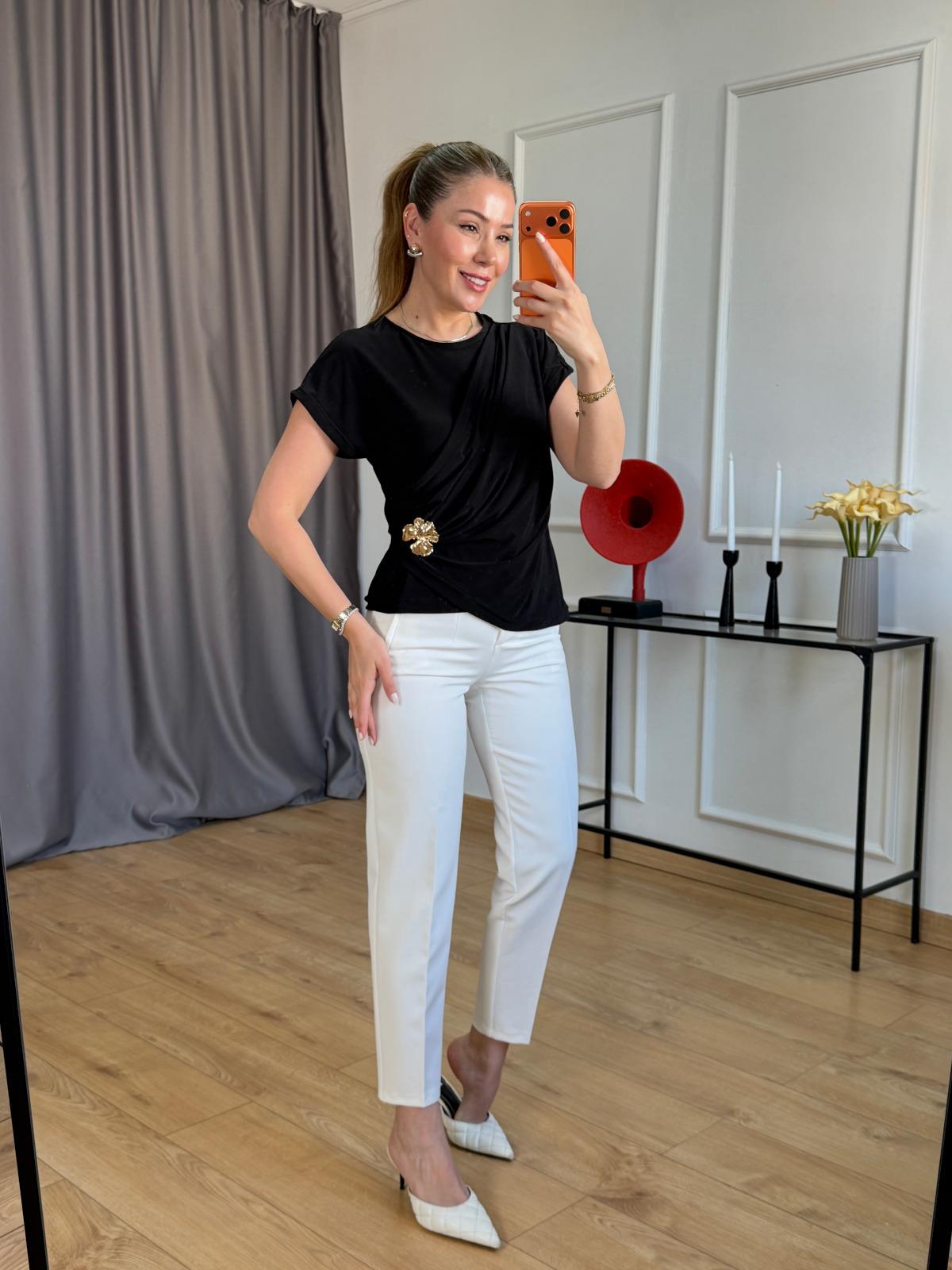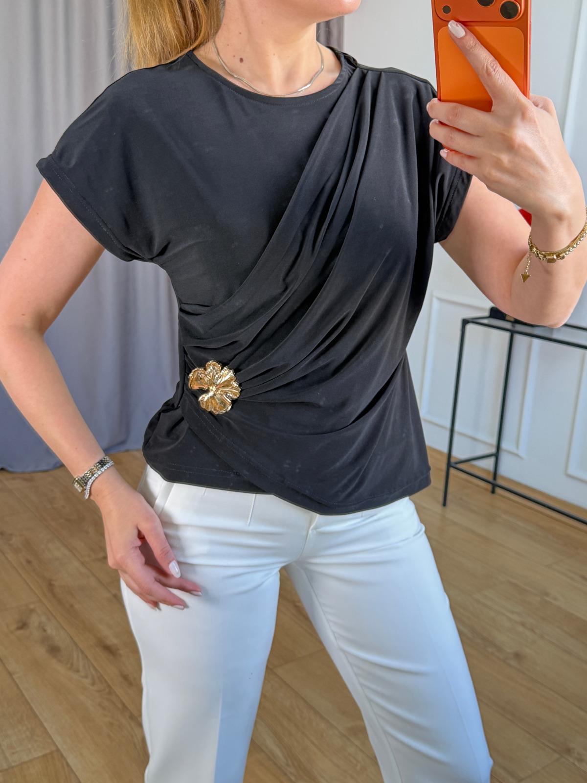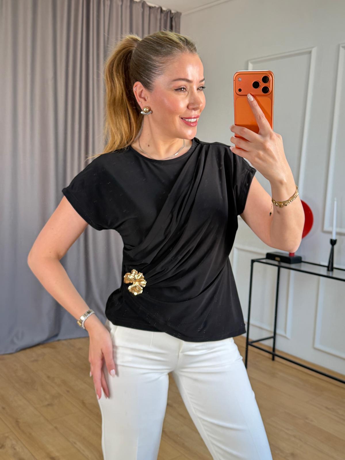 Siyah Drapeli Çiçek Broşlu Bluz